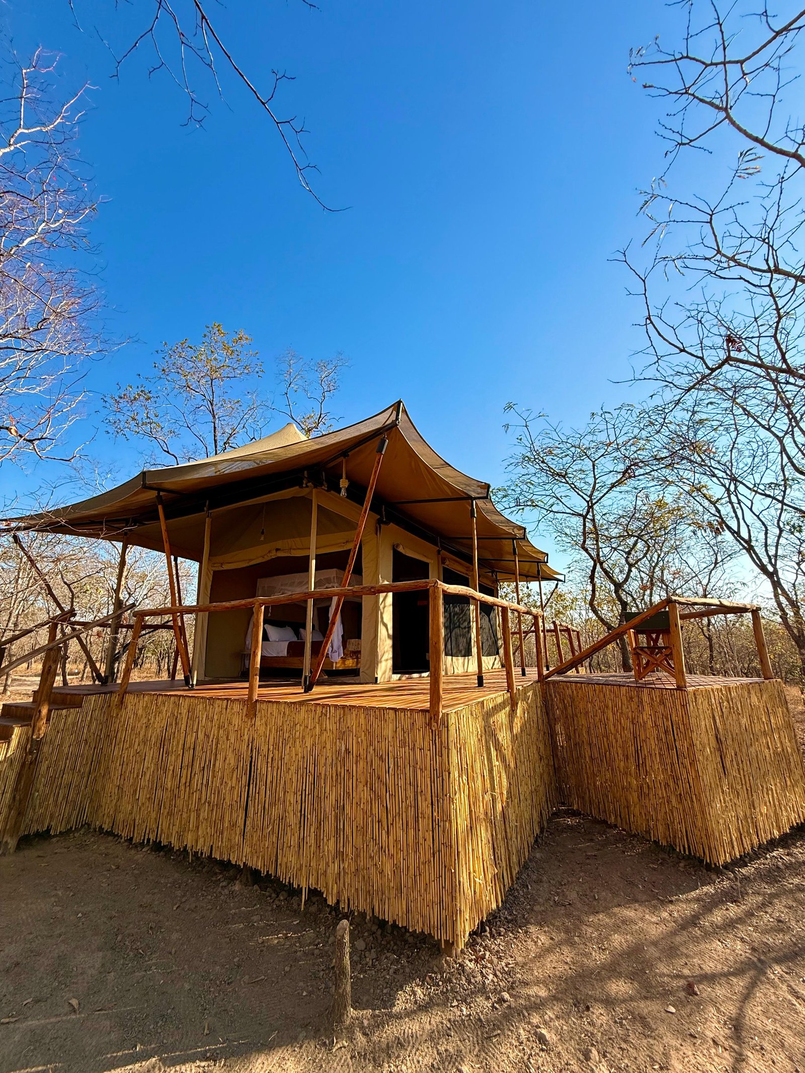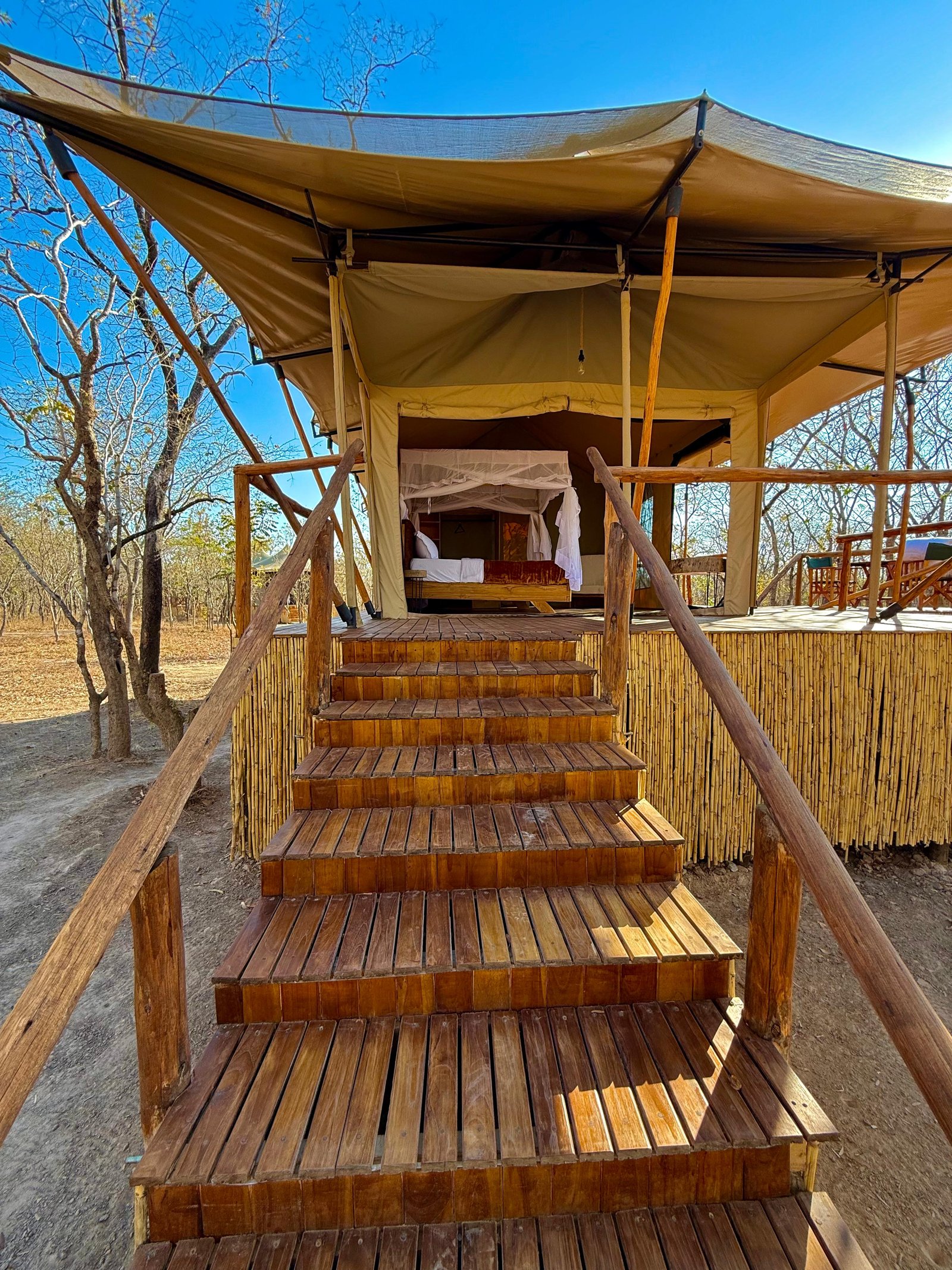 The camp features comfortable, well-maintained rooms with private bathrooms and simple modern amenities, designed to blend naturally with the surrounding environment. Guests can unwind in the garden areas or enjoy peaceful evenings under the African sky.