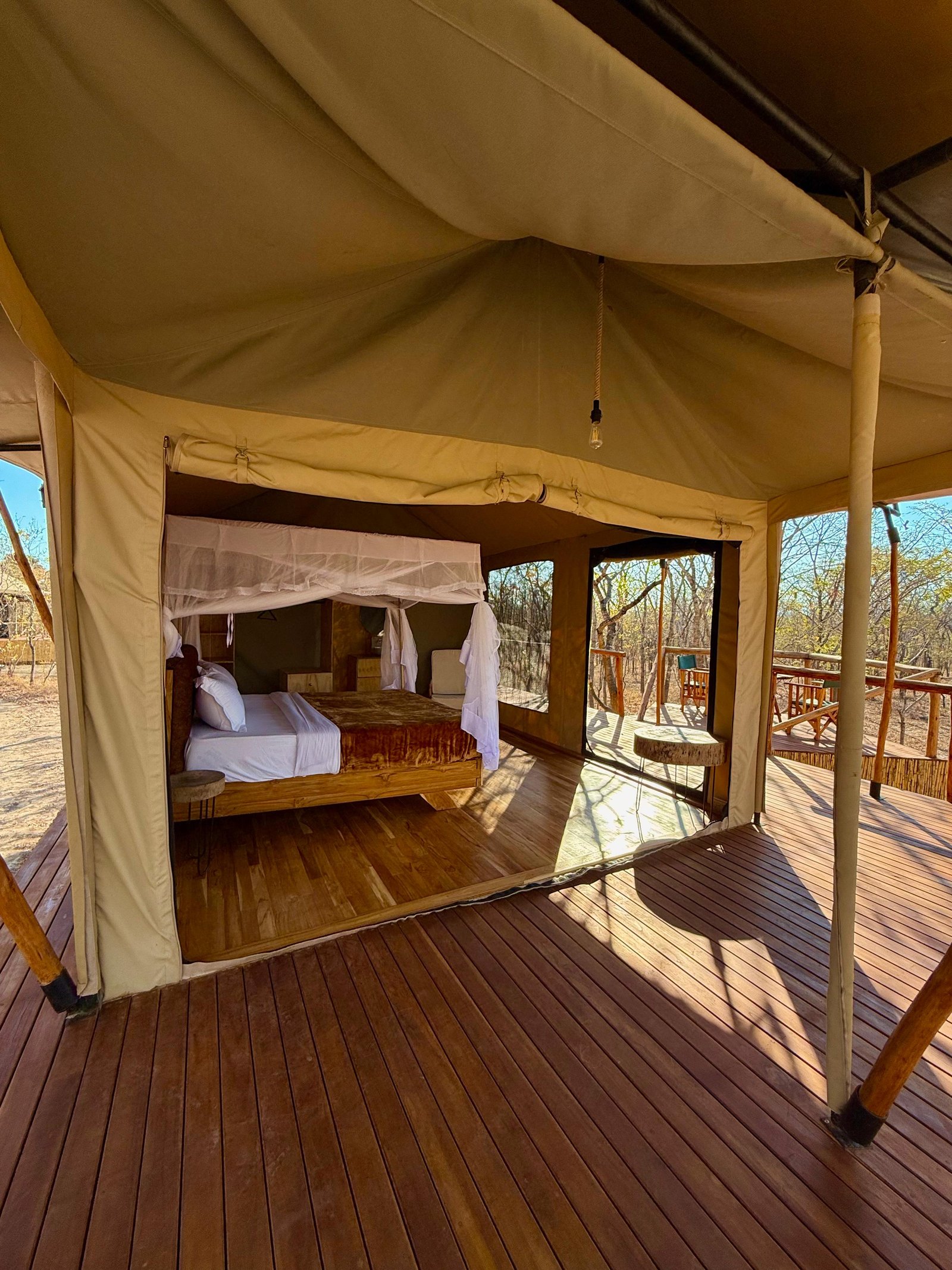 The camp features comfortable, well-maintained rooms with private bathrooms and simple modern amenities, designed to blend naturally with the surrounding environment. Guests can unwind in the garden areas or enjoy peaceful evenings under the African sky.